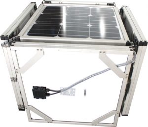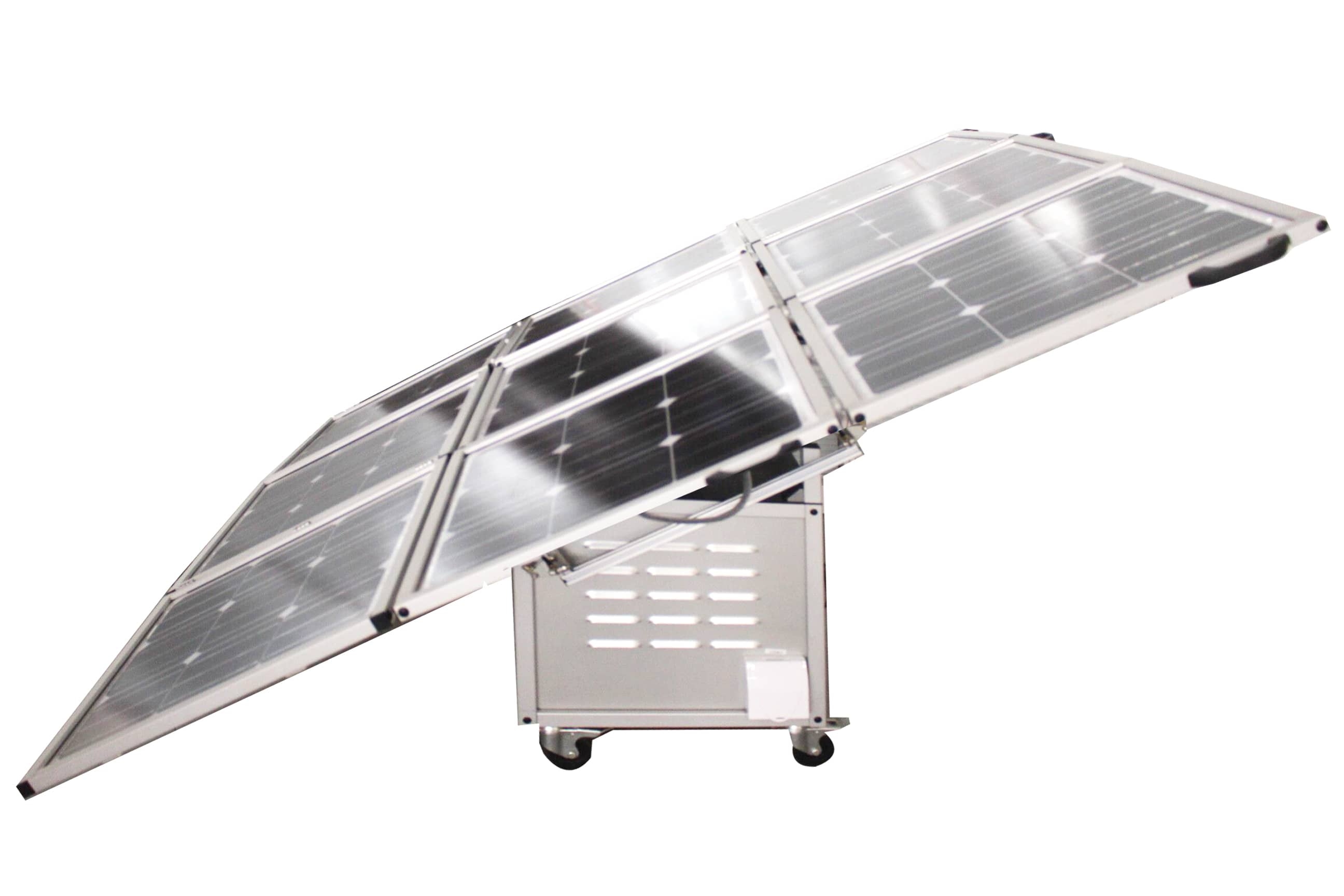 The mobile unit is fitted with sturdy wheels and solar panels, which fold in and out for easy storage and transportation. The battery and control system is located inside the cube, with an easy-to-open glass door.